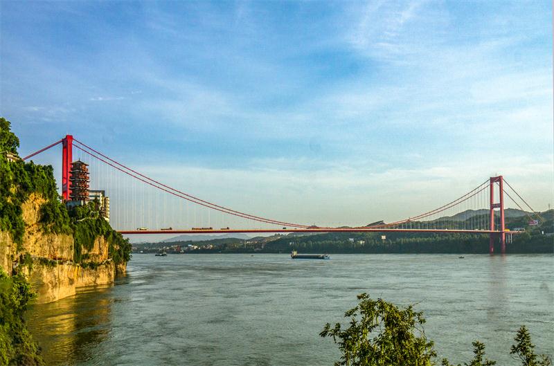 湖北宜昌長江公路大橋,懸索橋,主跨960米,2001年9月竣工通車,獲第五屆中國土木工程詹天佑獎(jiǎng)、中國建筑工程魯班獎(jiǎng)、首屆“中國十佳橋梁”、全國用戶滿意獎(jiǎng)等。